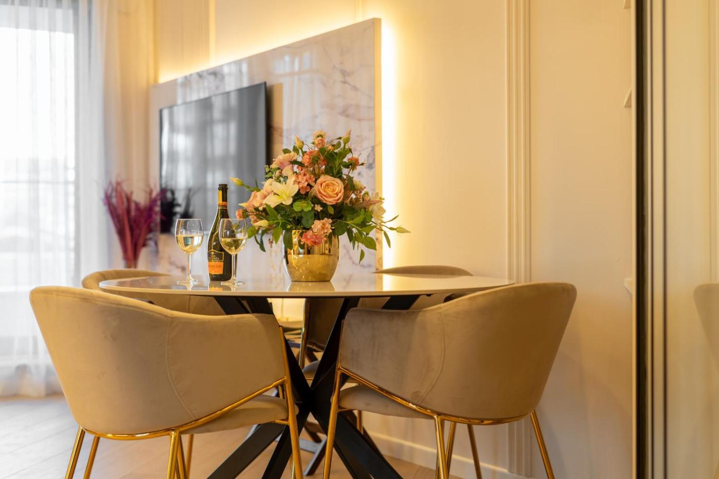 Oferta apartamentu obejmuje sypialnię (1), salon, kuchnię z pełnym wyposażeniem, w tym lodówką i ekspresem do kawy, a także łazienkę (1) z prysznicem oraz bezpłatnym zestawem kosmetyków. W apartamencie zapewniono ręczniki i pościel.